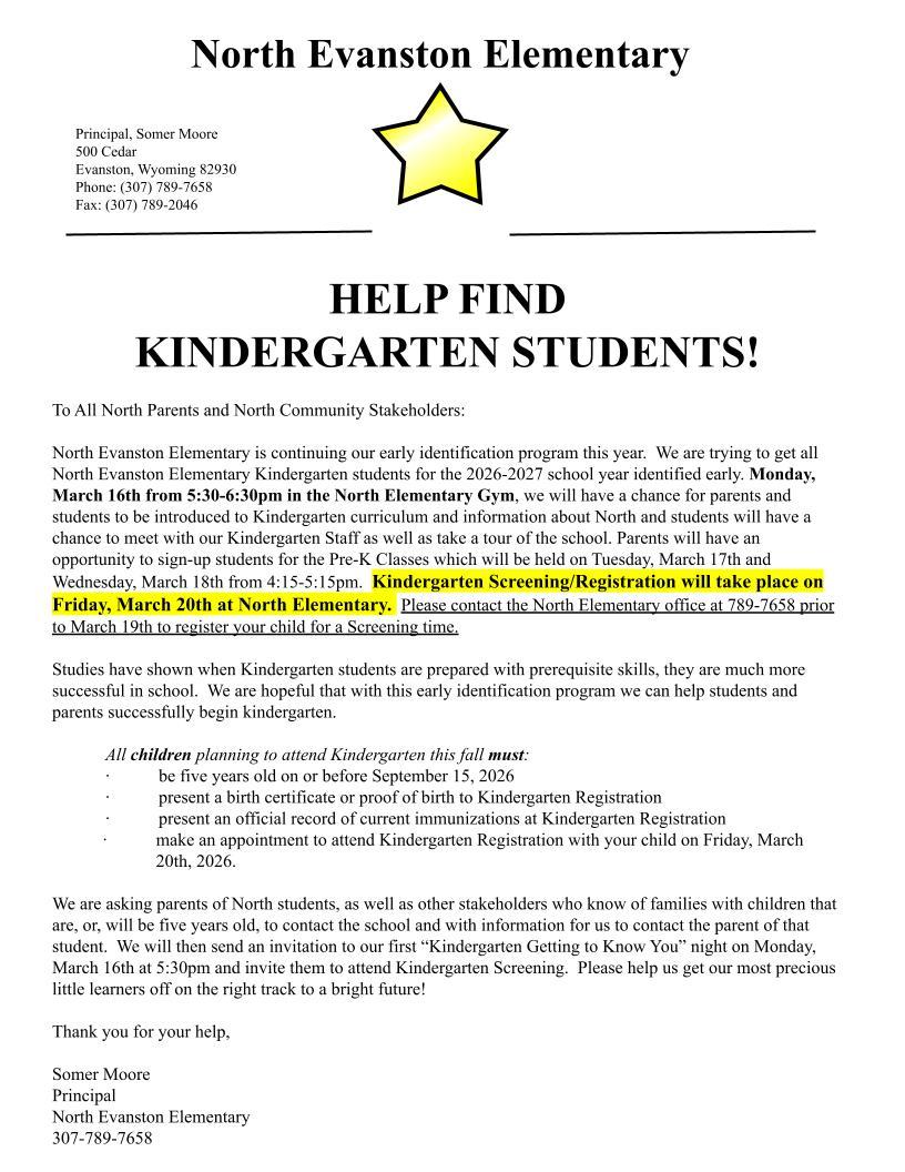 North Evanston Elementary is continuing our early identification program this year. We are trying to get all North Evanston Elementary Kindergarten students for the 2026-2027 school year identified early. Monday, March 16th from 5:30-6:30pm in the North Elementary Gym, we will have a chance for parents and students to be introduced to Kindergarten curriculum and information about North and students will have a chance to meet with our Kindergarten Staff as well as take a tour of the school.